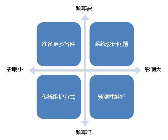 在这里借鉴美国智能维护系统(IMS)中心的分类,参考下图,纵轴代表故障发生频率,横轴表示故障发生后的影响。预测性维护适用于发生频率不高,但一旦发生影响很大的故障。