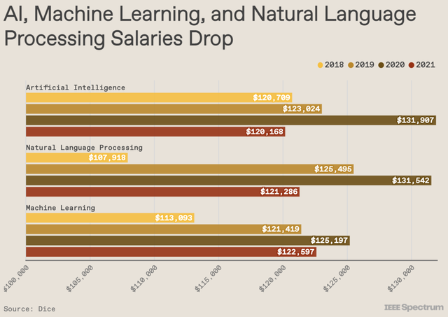 纽约在线招聘平台 Dice 发布的《年度科技人才招聘报告》显示,曾在2018、2019、2020年数次创造新高工资纪录的“人工智能”“自然语言处理”以及“机器学习”,平均薪资开始缓和,甚至出现了小幅下滑——分别下降了2.1% 、7.8% 和8.9% 。