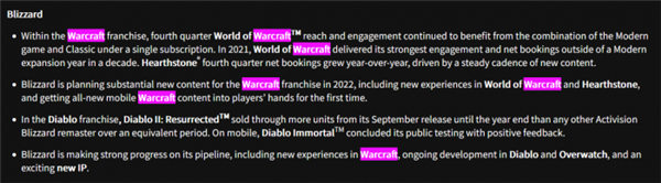 4日凌晨,动视暴雪公布了2021财年第四季度及全年财报。财报中,暴雪表示正在开发一个新的魔兽手机游戏,计划在2022年发布。(快科技)