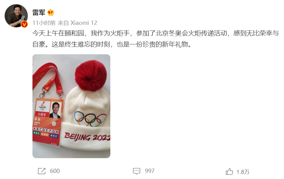 4日,小米创始人、董事长兼 CEO 雷军通过社交媒体表示,他在颐和园作为火炬手,参加了北京冬奥会火炬传递活动,感到无比荣幸与自豪。