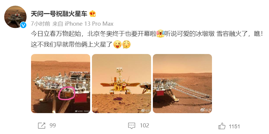 4日,天问一号探测器、五星红旗与北京冬奥会和冬残奥会会徽同框自拍,向地面的朋友们送上“最高”的冬奥礼物。天问一号祝融火星车官方微博还晒出带有北京冬奥会及冬残奥会吉祥物“冰墩墩、雪容融”的自拍照。(IT之家)