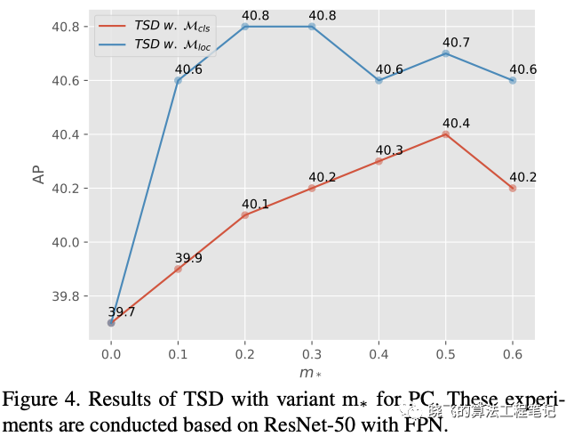 从图5可以看出,TSD的定位能够学习不易回归的边界,而分类则专注于局部特征以及目标的上下文信息,这里的点为区域 转换后的中心点