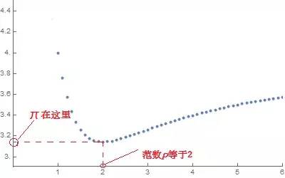 上面图像是范数p的取值与π关系。横坐标为范数p的取值,纵坐标是在不同范数的情况下“圆周率”的取值。图像是依据下面展示的公式绘制的。最后给出一组具体的数值供同学们参考。