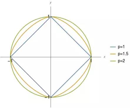 现在让我们再次回到单位圆的问题,考虑一下在不同范数下单位圆的形状有何不同。