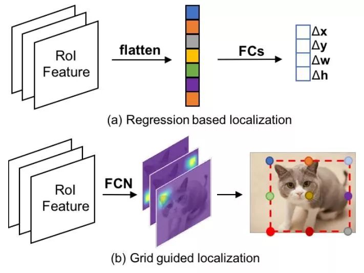 在双阶段算法中,如FPN,RCNN系列、Cascade RCNN、Mask RCNN等算法都有一个共同的特点,就是边框定位模块是相同的。它们将边框定位视作一个回归分支,一般经过几个全连接层对输入的feature map进行预测偏差(proposal或者predefined anchor)。