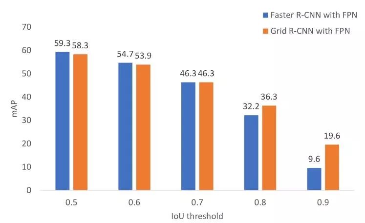 从上图可以很容易看出,Grid RCNN不改变网络结构,只是通过改变最后回归分支的结果和方法,从而达到了很精确的边框定位。虽然在IOU 0.5阈值下略有下降,但这个思路值得学习,特别追求IOU阈值比较精准的任务中。