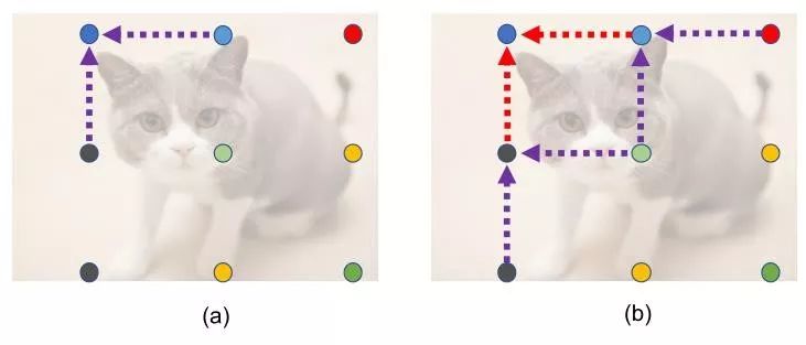上图为网格点特征融合的结构,图b为GridRCNN的关键点信息传播方向,为了可以分辨不同点的feature map,我们使用NxN组卷积和对最后一个特征图提取特征,因此每个特征图都很明确对应一个gridpoint。对应每一个grid point,与这个点距离1个单位网格长度的点叫做源点,并定义第i个grid point为 ,因此第j个源点经过三个连续的5x5卷积后,然后与原来点的特征图进行融合,这就是图a的情况(一阶融合策略)。当然图b是允许与该点距离为2个单位长度的点进行融合(二阶融合策略)。其中三个5x5的卷积就相当于信息转换算子