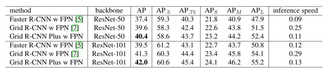 虽然原版的Grid R-CNN对FasterRCNN做了很多精度上的优化,但是速度却慢于Faster RCNN,于是作者就其进行改进并进行了开源,开源地址见开头!Res50+FPN作为主干网络的Grid R-CNN Plus达到了40.4%的AP,相比FasterRCNN,精度增长了3.0%,速度却几乎相同。