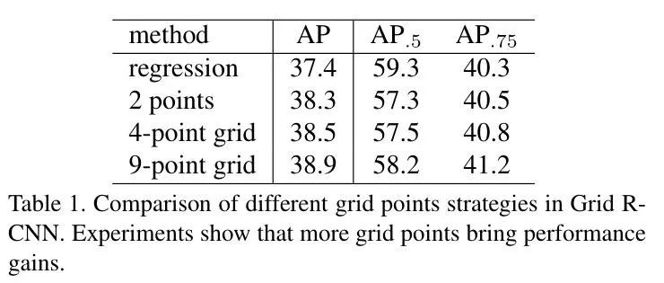 对比了传统的回归算法,在2-point使用真实框的左上角和右下角的点,在4-point中增加了另外两个角点的监督,9-point就是论文示例中的普通3x3grid。其最后的结果显示,越多的grid point监督效果越好。