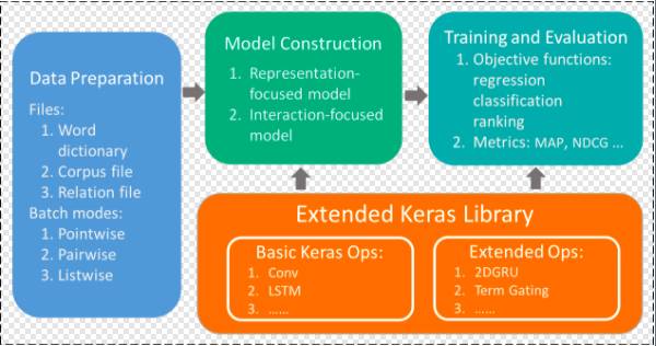 MatchZoo使用了Keras中的神经网络层,并有数据预处理,模型构建,训练与评测三大模块组成: