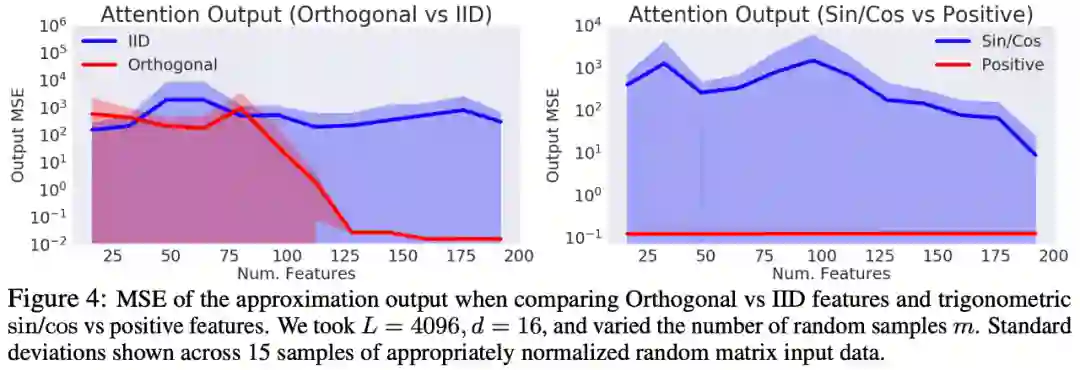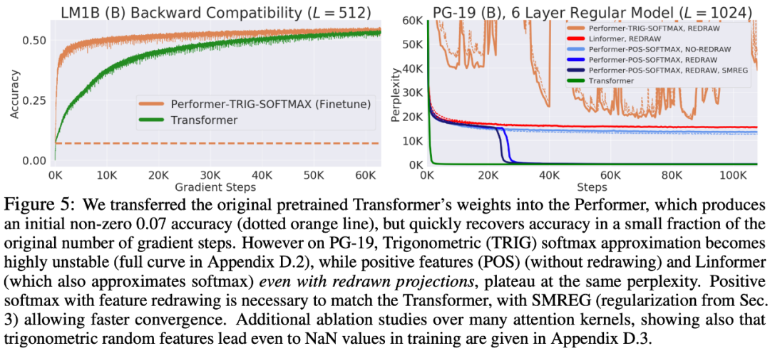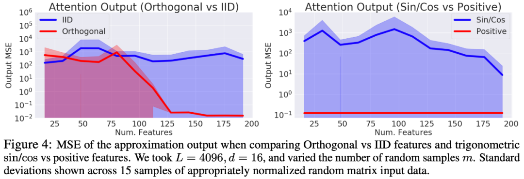 ▲ 左图:比较采样向量正交化的有效性;有图:比较Performer所用的近似与旧的基于三角函数的近似的精确性