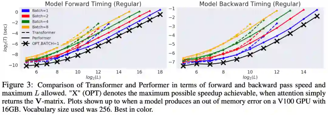一开始是速度上的评测,这个不意外,反正就是序列长了之后 Performer 比标准的 Transformer 有明显优势: