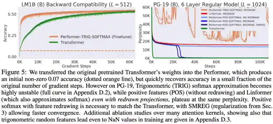 那能不能达到我们一开始的预期目标——不用重新训练已训练好的模型呢?很遗憾,不行,原论文做了两个实验,显示 Performer 直接加载 Transformer 的权重不能恢复已有的结果,但经过 finetune 后可以迅速恢复回复。至于为什么一开始没有很好地回复,论文没有做展开分析。