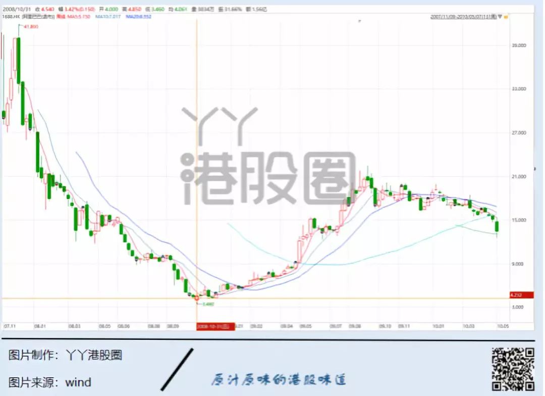 在金融危机最为严重的10月,阿里股价跌至3.46港元的低位,不到一年前发行价的3成,和41.8元的高位相比,跌幅超过9成,惨不忍睹。