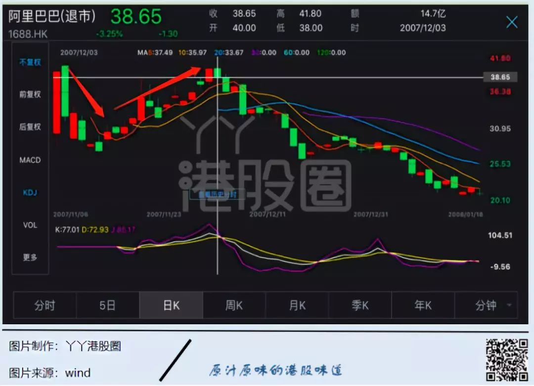 12月3号,阿里股价再次突破40港元,触及41.8港元的高位,这是阿里巴巴的高光时刻,也是阿里巴巴和香港股民最为你侬我侬的蜜月期。