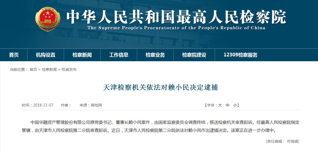 据最高检11月7日消息,中国华融资产管理股份有限公司原党委书记、董事长赖小民案件,由国家监察委员会调查终结,移送检察机关审查起诉。经最高人民检察院指定管辖,由天津市人民检察院第二分院审查起诉。近日,天津市人民检察院第二分院依法对赖小民作出逮捕决定。该案正在进一步办理中。