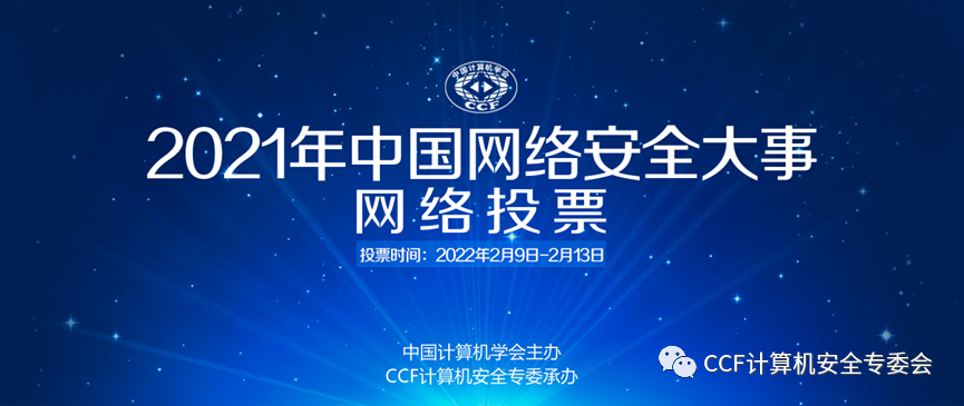 由中国计算机学会主办,中国计算机学会计算机安全专业委员会承办的的2021中国网络安全大事评选活动,网络投票将于2022年2月9日-2月13日举行。希望所有关心和支持网络安全的同仁积极参与投票活动,期待您的投票。
