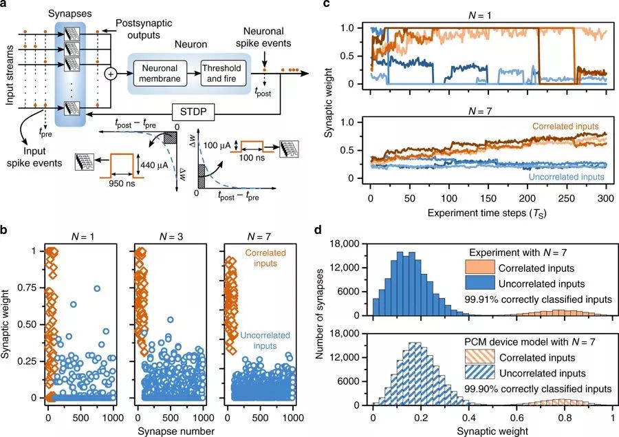 b.在实验结束时,显示了由N = 1、3和7个PCM设备组成的突触权重。可以看出,接受相关输入的突触的权重往往大于接受不相关输入的突触的权重。随着N的增加,权重分布更加清晰。