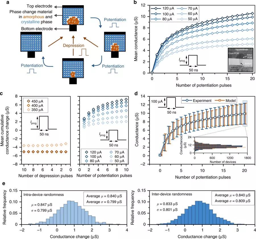 a.PCM器件由夹在顶部和底部电极之间的相变材料层组成。增强脉冲(potentiation pulses)的应用可以逐渐增加晶区(crystalline region)。衰弱脉冲(depression pulse)会产生一个非晶区,不论设备的原始状态如何都会导致电导的骤然下降。