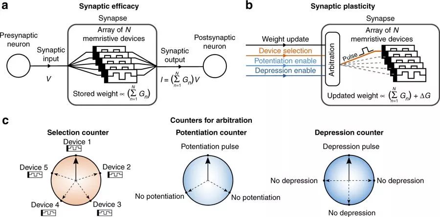 a.一个多记忆突触的突触净权重(net synaptic weight)是由多记忆设备(multiple memristive devices)电导累加和()表示。为了实现突触效能(synaptic efficacy),所有设备都使用电压读取信号(read voltage signal),V。通过每个设备产生的电流被汇总起来,由此产生突触输出(synaptic output)。