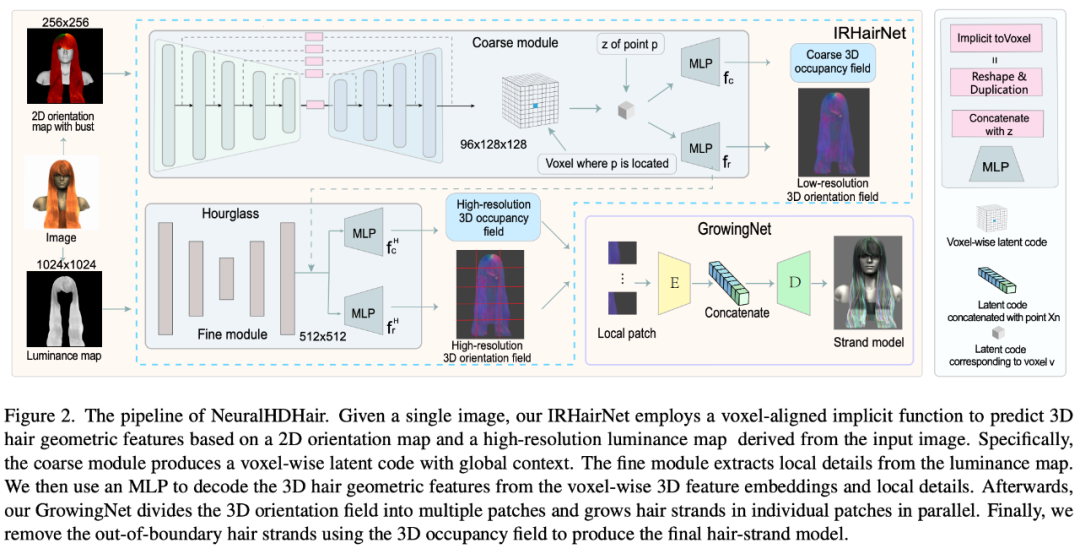 介绍了一个从粗到细的毛发建模神经网络(IRHairNet) ,使用一个新颖的 voxel-aligned 隐函数和一个亮度映射来丰富高质量毛发建模的局部细节;