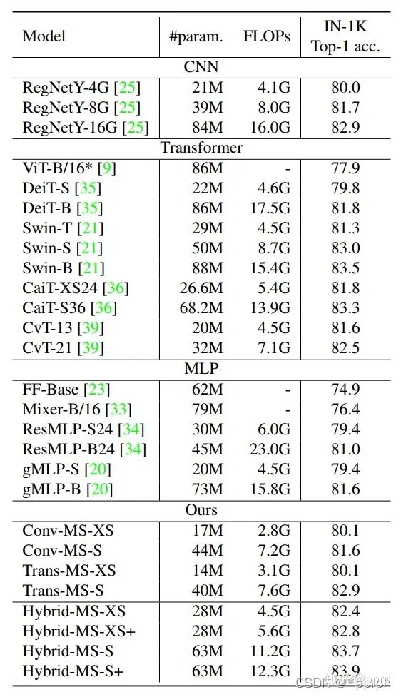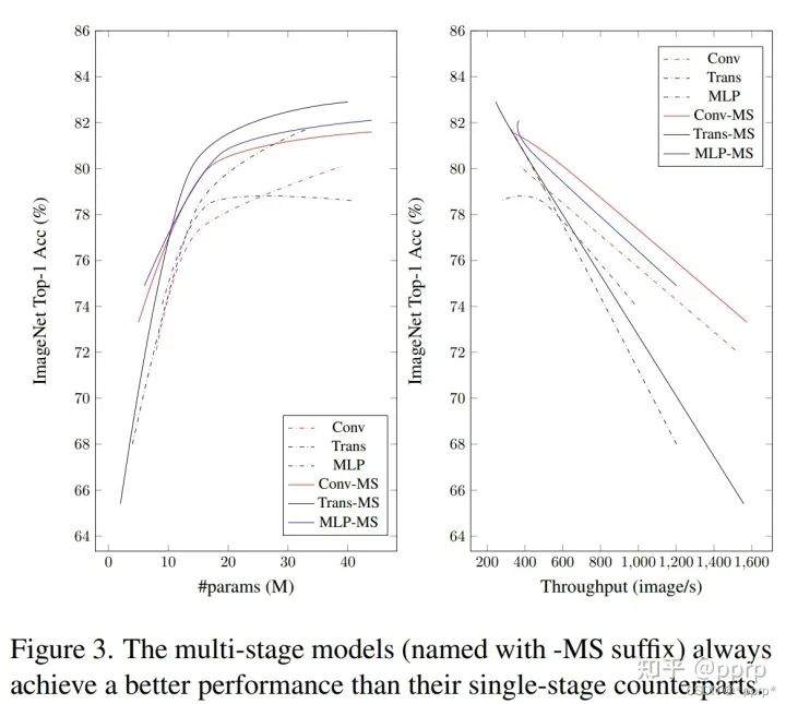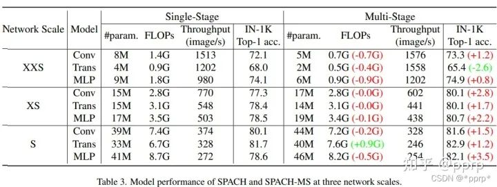 可以发现,有一个例外,在xxs尺度下,Transformer进度损失了2.6个百分点,因为多阶段模型恰好只有单阶段模型一半的参数量和Flops。