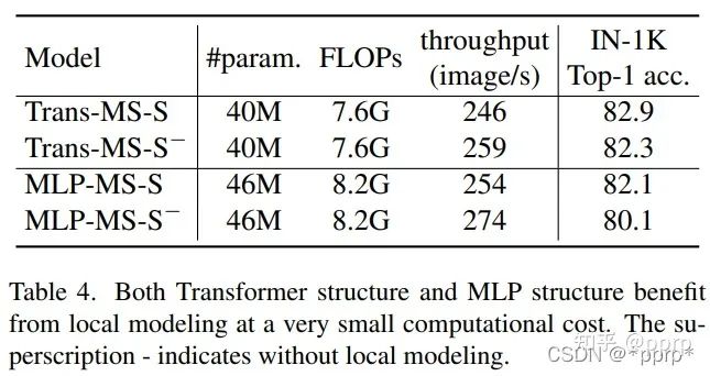 上表展示了具有局部建模以及去除局部建模的效果,可以发现使用卷积旁路的时候吞吐量略微降低,但是精度有显著提高。