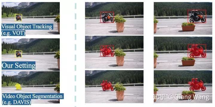 为了方便表述,早期的跟踪算法都是坐标轴对齐的的矩形框。但随着跟踪精度的不断提升,数据集的难度在不断提升,在 VOT2015 时即提出使用旋转矩形框来作为标记。在 VOT2016 的时候提出自动的通过 mask 来生成旋转框的方法。更为本质的,我们会发现,这个旋转的矩形框实际上就是 mask 的一种近似。我们所要预测的实际上就是目标物体的 mask。利用 mask 才能得到精度本身的上界。