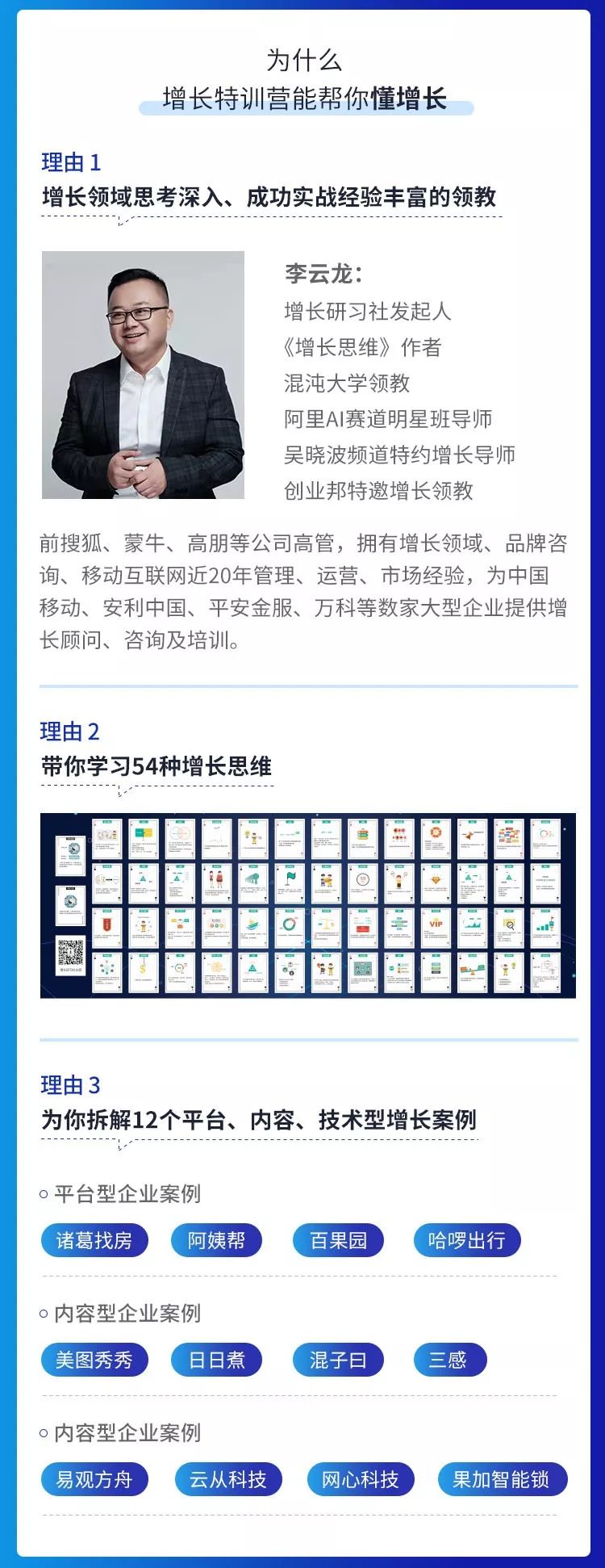 增长特训营致力于从思维、技巧、实战出发,帮助大家打开自己的思维局限,拥有顺应这个时代的增长能力,实现另一重的突破和分水岭的跨越。