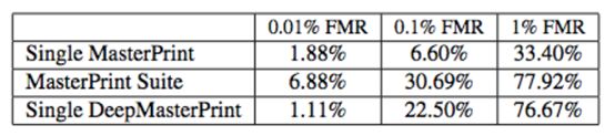 该研究首次创建了图像级合成 Masterprint,进一步强化了在指纹应用中利用分辨率低的小型传感器的风险。该研究直接展示了如何利用它以 0.1% 的错误匹配率伪造 23% 的主体指纹。生成的 DeepMasterPrints 在 1% 的错误匹配率下能够伪造 77% 的主体指纹。