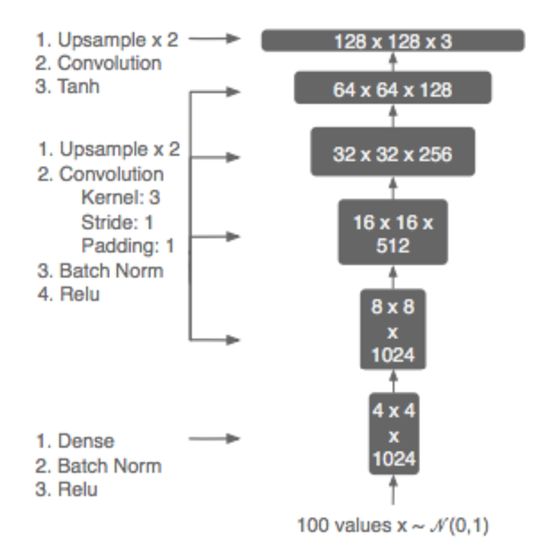 图 1:生成器网络架构。判别器与该模型相反,判别器使用的是子采样而不是上采样,使用的激活函数是 LeakyReLu。