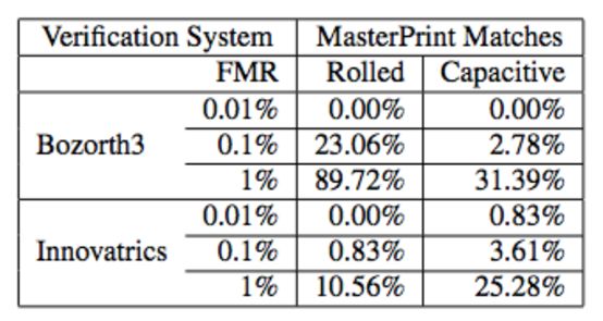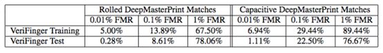 表 1:在电容式指纹数据集上的成功匹配结果。图 4 中的 DeepMasterPrints 是为 VeriFinger 软件而优化的,有三种安全级别,训练数据集是电容式指纹数据集。每种 DeepMasterPrints 在测试集上的有效性见上表。
