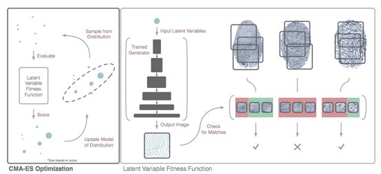 该论文展示了一种创建 DeepMasterPrints 的方法,该方法使用神经网络学习生成指纹图像。然后使用进化优化来搜索该神经网络的潜在变量空间。协方差矩阵自适应进化策略(Covariance Matrix Adaptation Evolution Strategy,CMA-ES)用于搜索完美指纹图像的已训练神经网络的输入空间。进化优化和生成神经网络的独特结合使得该神经网络可以约束搜索空间,同时进化算法可以处理离散适应度函数。