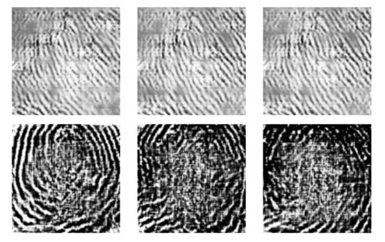 图 4:按压指纹的进化 DeepMasterPrints(上),电容式指纹的进化 DeepMasterPrints(下)。从左至右,每个指纹分别为 0.01%、0.1% 和 1% 的 FMR 进行优化。