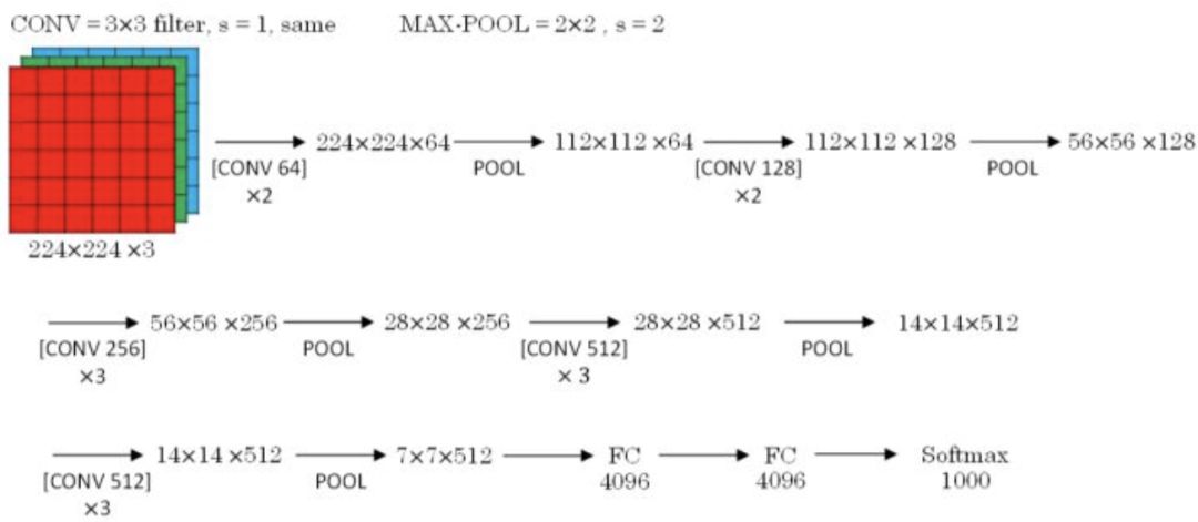 VGG-16模型更加复杂一些,一般情况下,其CONV layer和POOL layer设置如下: