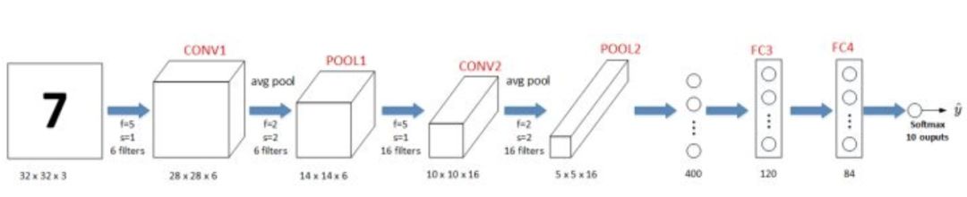典型的LeNet-5结构包含CONV layer,POOL layer和FC layer,顺序一般是CONV layer->POOL layer->CONV layer->POOL layer->FC layer->FC layer->OUTPUT layer,即 y^。下图所示的是一个数字识别的LeNet-5的模型结构: