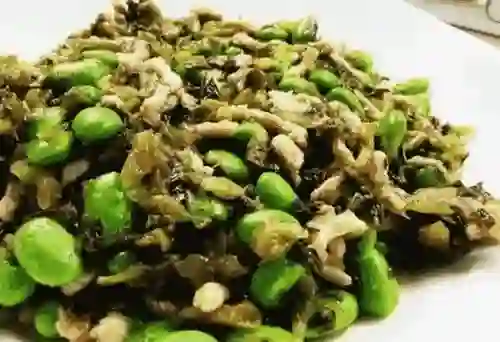 有些人在这三样中又加上毛豆,变成雪菜毛豆肉丝,则在单一的雪菜和肉中,又变幻出一种味道。毛豆的口感很好,同时在乌色的色彩中又跳出一丝绿,更增加食欲。