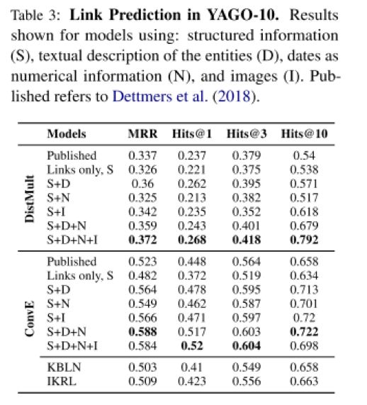 1 链接预测:可以看到在引入了实体文本描述,图片和数值之后,利用之前的嵌入模型,达到了SOTA的效果
