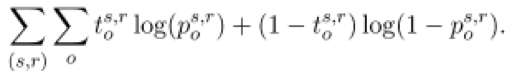 其中:t^(s,r) 是一个one-hot向量。如果知识库中存在 <s, r, o> 这个三元组,t_o^(s,r) 值为1,否则 t_o^(s,r) 值为0。
