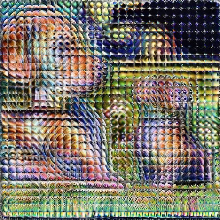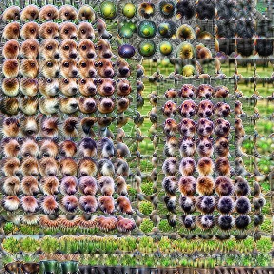 而且,通过跨越层进行研究(例如“mixed3a”、“mixed4d”),我们可以观察网络的理解是如何演变的:从检测早期层中的边缘,到后者中更复杂的形状和对象部分。