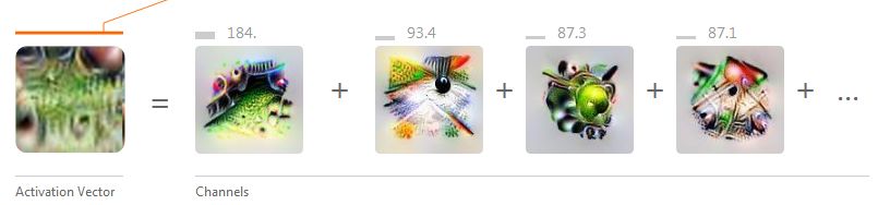 语义词典为我们提供了一个关于激活的细粒度观察:每个单个神经元能够检测到什么?在这种表示的基础上,我们也可以将激活向量作为一个整体进行考虑。我们可以对给定空间位置处发射的神经元组合进行可视化,而不是对单个神经元进行可视化。(具体来说,我们对图像进行优化,以最大化激活点与原始激活向量的点积。)