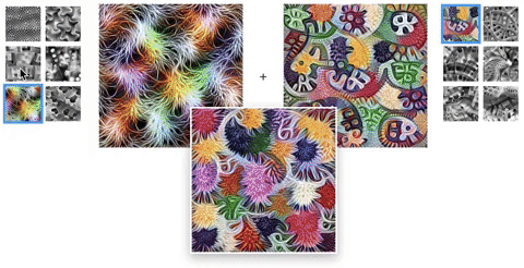 通过在神经元之间插值,我们可以更好地理解他们是如何彼此交互的。下图就展示了两个神经元是如何共同表示图像的。