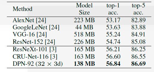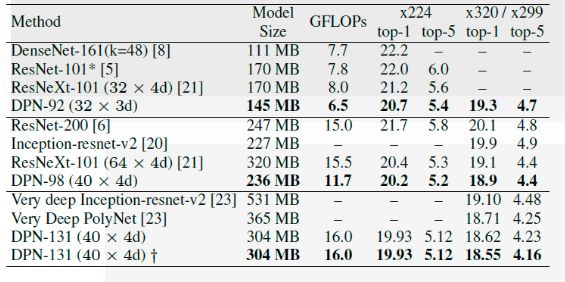 一个更深的DPN (DPN-98)超过了最好的残差网络ResNeXt-101(64×4d),但仍然可以减少25%的FLOP和更小的模型,模型大小(236mb vs . 320 MB)。