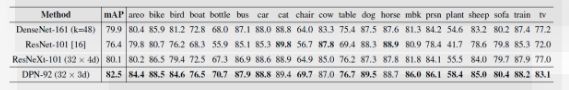 DPN得到的mAP为82.5%,与ResNet-101相比提高了6.1%,与ResNeXt-101相比提高了2.4%(32×4d)。