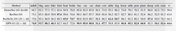 与ResNet-101相比,ResNeXt-101(32×4d)仅提高了mIoU的绝对值0.5%,因此提出的DPN-92比ResNeXt-101(32×4d)提高了3倍以上。