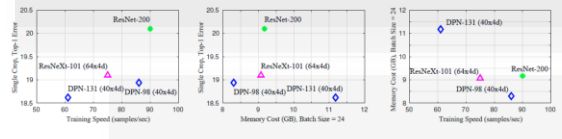 基于MXNet的重现,PolyNet(537层)[23]的训练速度约为每秒31个样本,表明DPN-131在训练过程中运行速度约为PolyNet的2倍。