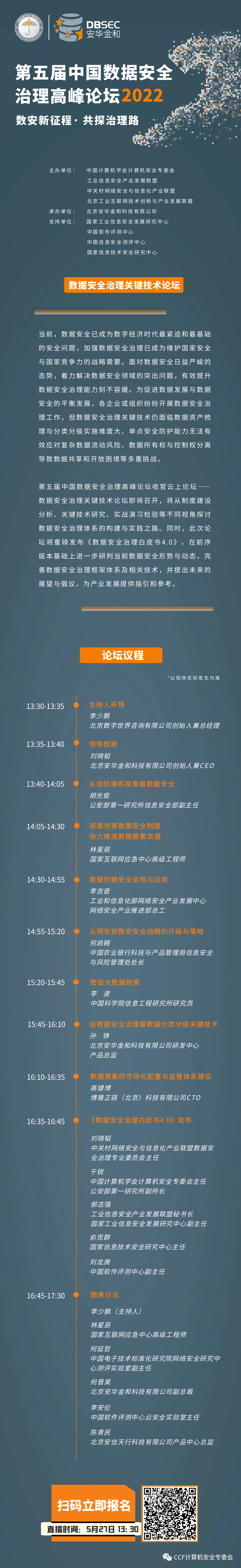 为帮助企业或组织解决数据安全方面的困惑和难题,实现数据利用与安全防护一体两翼、平衡发展的目标,有效应对新形势下的各种数据安全挑战,《数据安全治理白皮书4.0》应势而生,并将于第五届中国数据治理高峰论坛收官云上论坛——数据安全治理关键技术论坛上重磅发布!