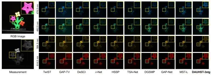 图6 展示的是各类方法在真实数据集上的对比。可以看出只有我们的方法能够在各种波长的光谱上稳定地重建出小花并同时抑制噪声的生成。