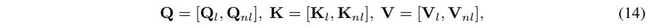 等分后分别输入到两个分枝,local 分枝和 non-local 分枝,其中的 local 分枝计算 self-attention 如下: