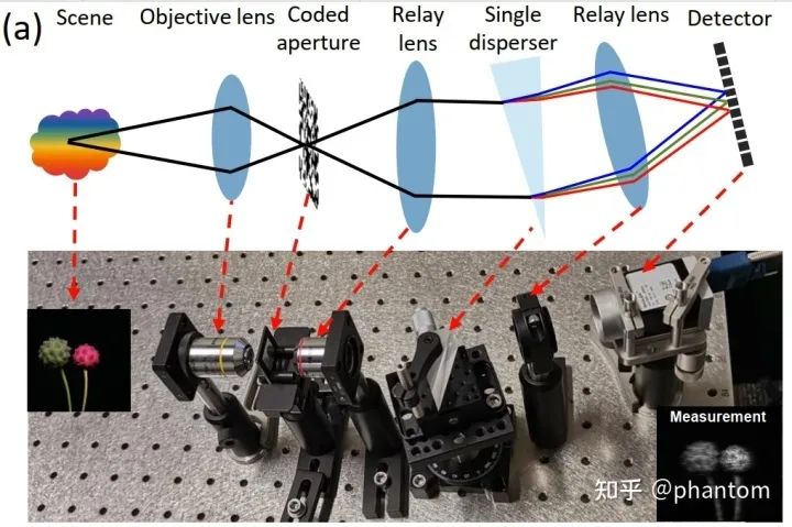 单曝光快照压缩成像(Snapshot Compressive Imaging,SCI)的任务是将一个三维的数据立方块如视频(H×W×T)或高光谱图像(H×W×λ)通过预先设计好的光学系统压缩成一个二维的快照估计图(H×W)从而大幅度地降低数据存储和传输的开销。常见的单曝光快照压缩成像系统有 Coded Aperture Snapshot Spectral Compressive Imaging (CASSI),如下图所示